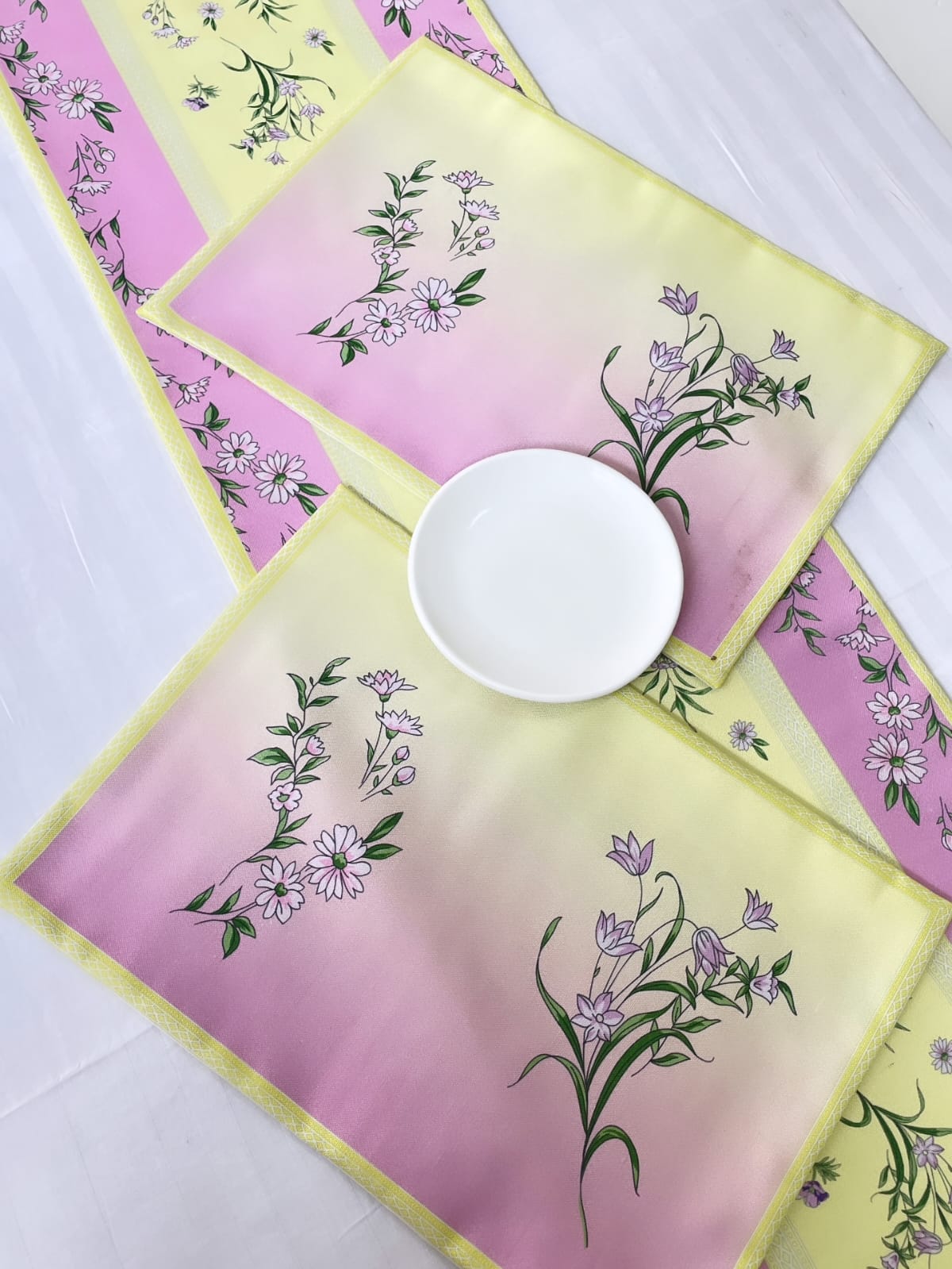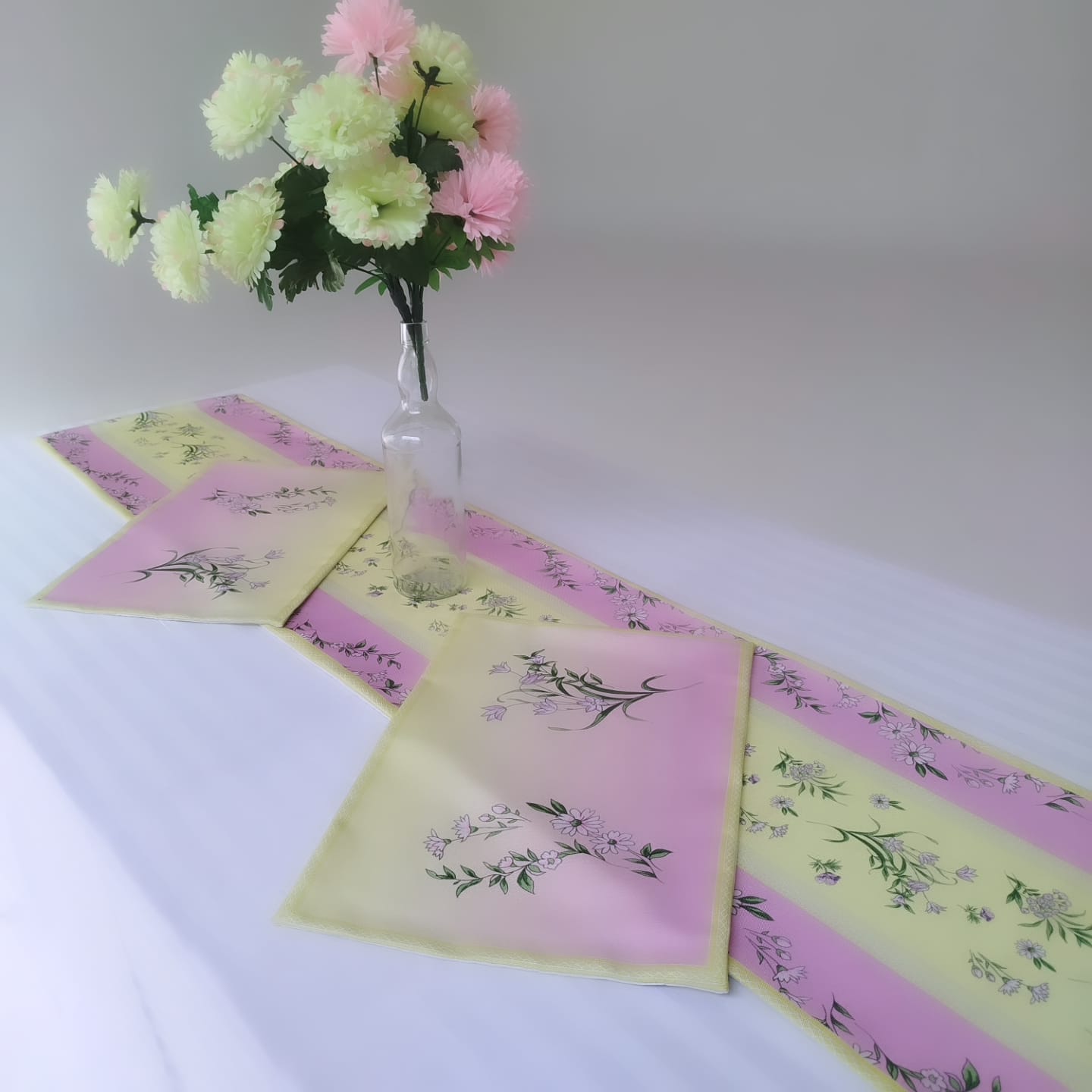 | Size | Table runner, Placemats, Napkins, 1 runner with 4 mats, 1 runner with 6 mats, 1 runner with 8 mats, 1 runner with 12 mats (72 inch runner), 1 runner with 12 mats (108 inch runner) |
